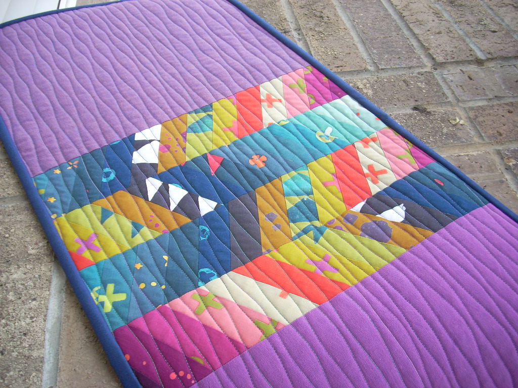 It’s definitely time to break away from the red and green of Christmas sewing and into something fun. I love the contrast of the blue binding on the purple background. It sure catches the eye.