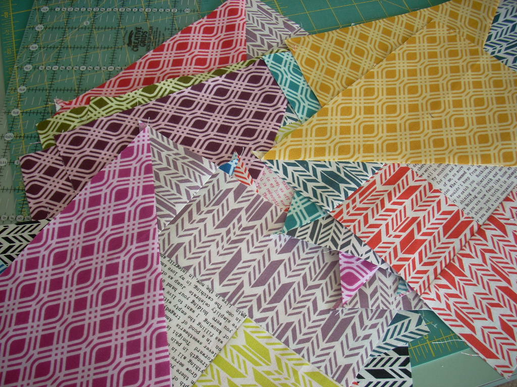 I paired a pieced block with a Party Streamer square, sewed a diagonal line to achieve these half square units.