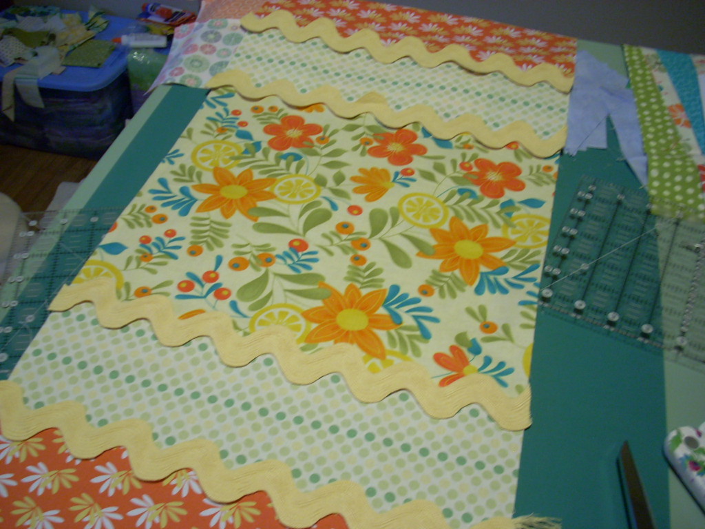 A few weeks ago my friend Donna sent me this great leftover fabric along with photos of a runner idea she had done. Well it was just what I needed to get my creative jucies flowing! I added the dot fabric and then went down to my local shop for the rickrack. I wish they had had lime green, but I do like the yellow too. So here is what I have so far. I had great plans of quilting this and listing it this week, but Monday I received a phone call from a client who needed something done this week, so hopefully soon this will be completed! Like the orange, yellow and green???