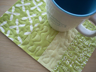 In hopes of Spring, this week I created a few mug rugs focusing on green.  This is Reunion and