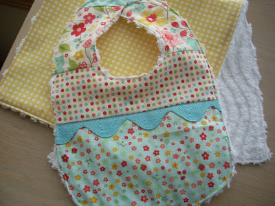 Really cute bib and burp cloths. Those fabrics would make some more really cute one.