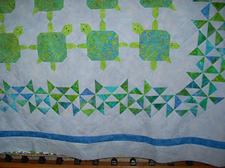 The Turtle Quilt is done!!!!! Yes this weekend I finally accomplished adding the final borders and sewing the back together – yeah! So this morning it is off to the quilter. So here are some photos to enjoy. Of course there are many more projects on my list, so be watching. I am working again on a fun kid quilt I bought fabric for this summer. Enjoy the day!