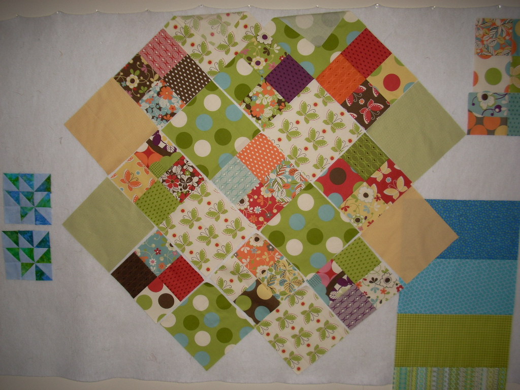 Remember the wonderful fabric I bought in California with my girlfriend? Well this weekend I decided to start something fresh as my projects have hit some roadblocks. So I sewed my charm pack from MoMo’s new line into 4-patches and added some set squares cut from the same line. Then I set them on point. The photo of fabric is what I am planning to use for setting side triangles. I have a few ideas about borders, but need to see the side triangles on first. This is a variation of a pattern from Quilted Fish that I have. I did accomplish some piecing on other projects, but that is for another post.