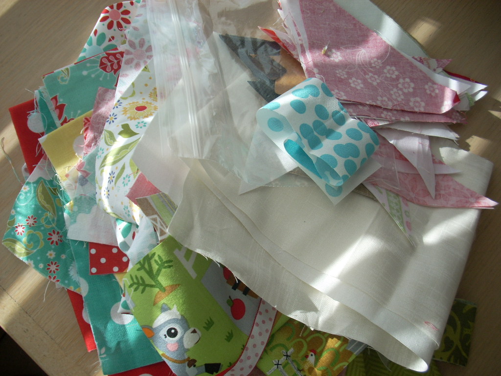 The jungle prints are so cute — that toucan cracks me up! Your stack of scraps (especially the aquas) is lovely as usual. You always have such pretty fabrics.