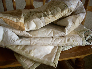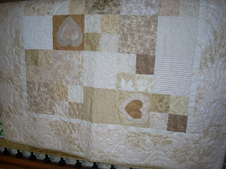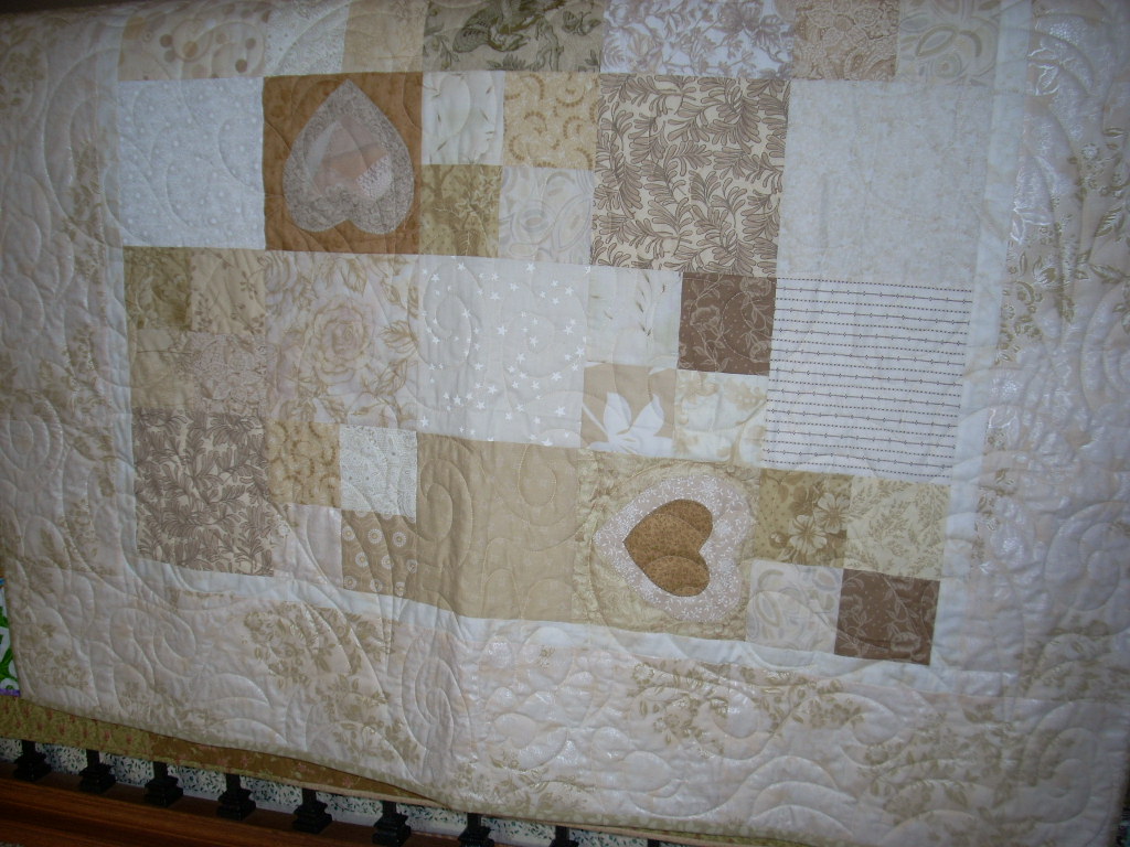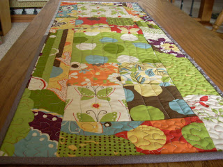 Yesterday the mail man brought me a wonderful box – the wedding quilt all finished! It never ceases to amaze me how much better a quilt looks once it is quilted! You may remember my post about this quilt top, well now it is done and ready for the wedding next month! Speaking of weddings, we have one tonight and so I made a runner for our gift – you like? It is one of my most popular items in the shop! Remember my Christmas in July sale is on for one more week! Happy Friday!