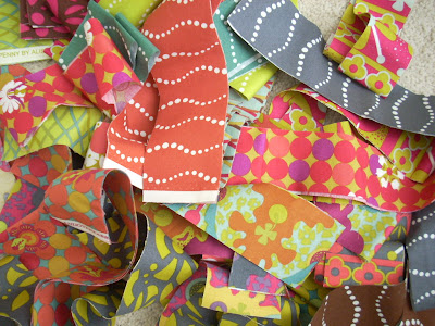 I began by cutting 2 and 2 1/2 inch strips of the entire line. From the large main prints, I cut an 8 1/2 square and a 4 1/2 x 8 1/2 rectangle.