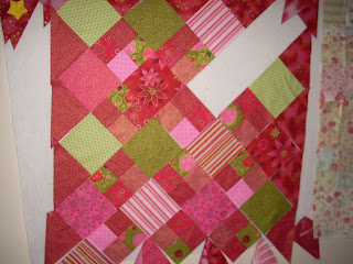 Here are some other projects that I am working on in my studio right now. The first is using some bright Christmas fabrics I picked up in Lincoln. I am using a pattern by Quilted Fish called Sassy Squares. I made a change by adding side triangles for the diagonal set.