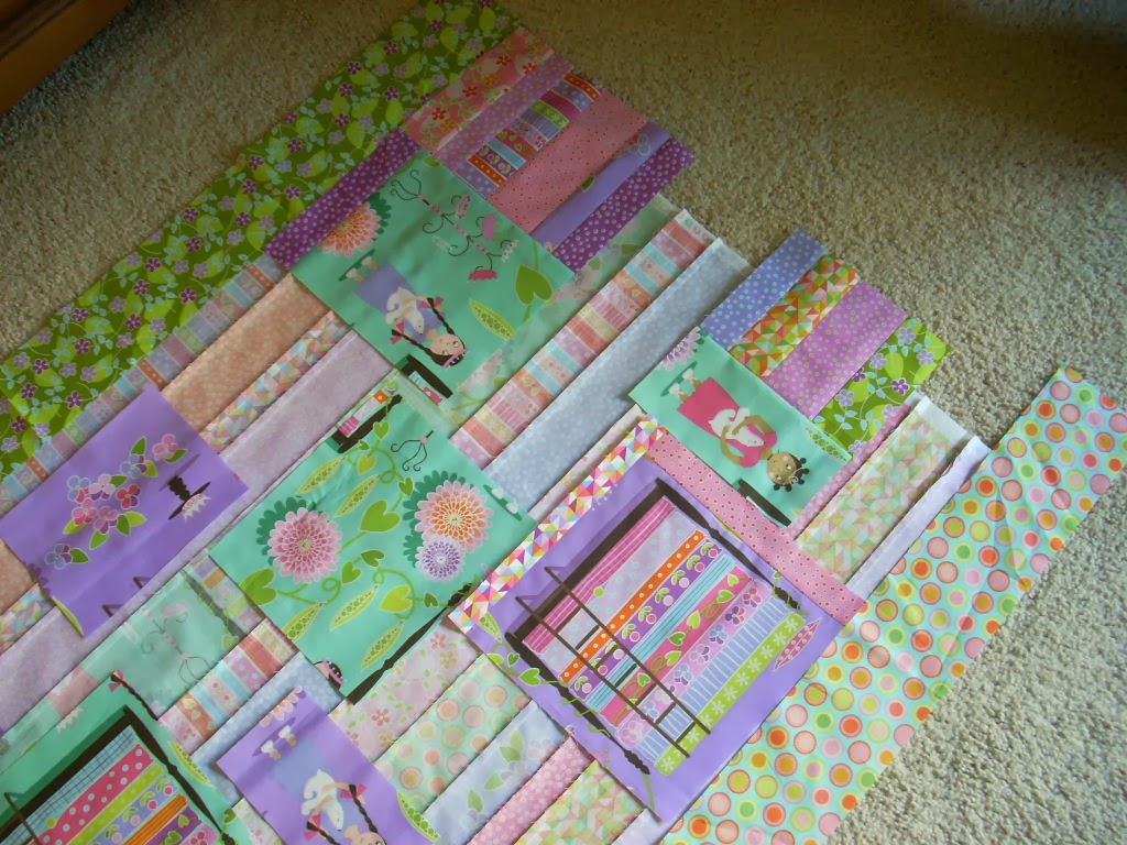 Sewing this side together is a lot like building a puzzle.  You cut and sew a bit and repeat.  I did lay my 3.5 inch borders for the top and bottom for placement guides.  To help distribute color and prints, I sew short strips together rather than sewing the full width of fabric.