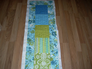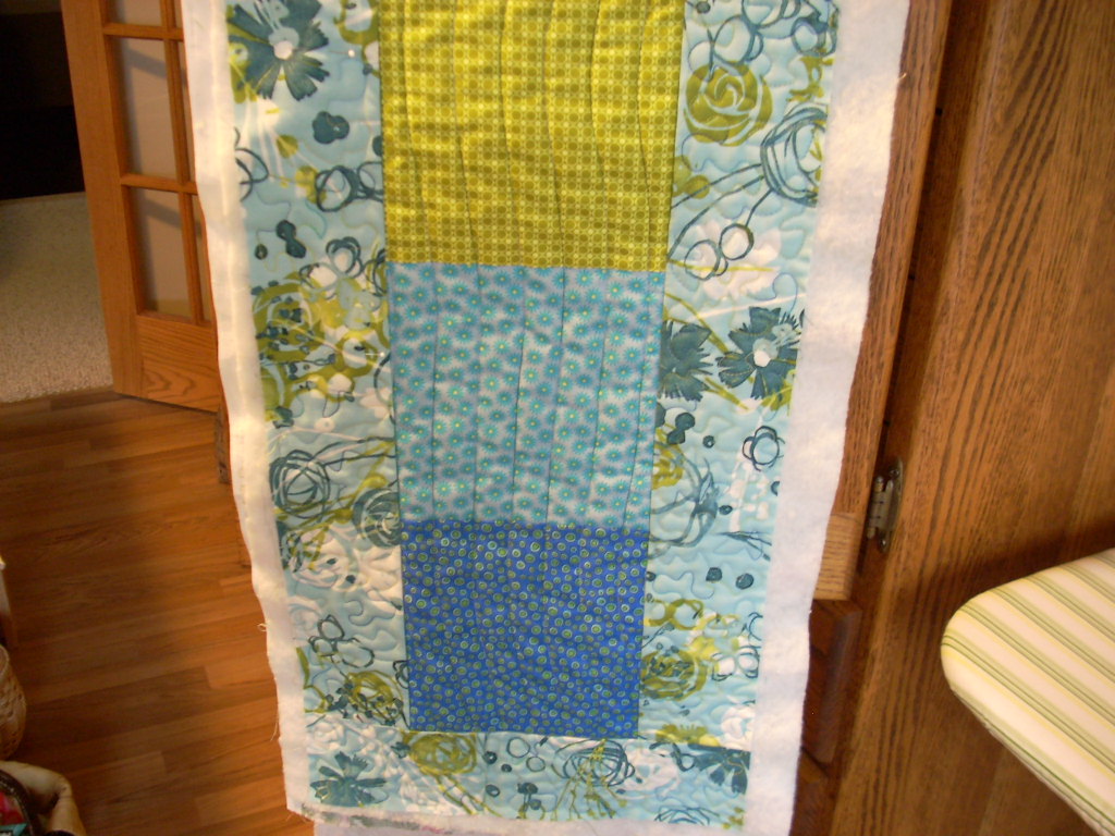 Here is my new runner project using blues and greens. The border fabric was something I bought for Ashley’s wedding quilt, but didn’t like it as a border once the quilt was together. While I was working on this project over the weekend, my darning foot broke 🙁 so it sits until the replacement arrives – hopefully soon!