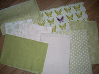 Remember when my Mom was here and we went shopping?  Well at the Quilted Moose, Deb mentioned something about an idea a customer had using this butterfly fabric from MoMo with greens from Sweetwater.  That idea got me thinking and I couldn’t let the idea go.  Well I found the butterfly fabric at Cosmic Cow and bought some, but they didn’t have any of Sweetwater’s authentic line.  So….I turned to my favorite online shop – Fabritopia and ta da!!!  So here is what I bought.  Well then as I was checking posts from other blogs, I saw this great idea done by Polka Dot Chair (check this out she mentioned me in her blog today!) and knew I needed to try it!  Well here is the end result.  It is for sale in my etsy shop too.  I think I will need to make some more!  Thanks to all for great inspiration!