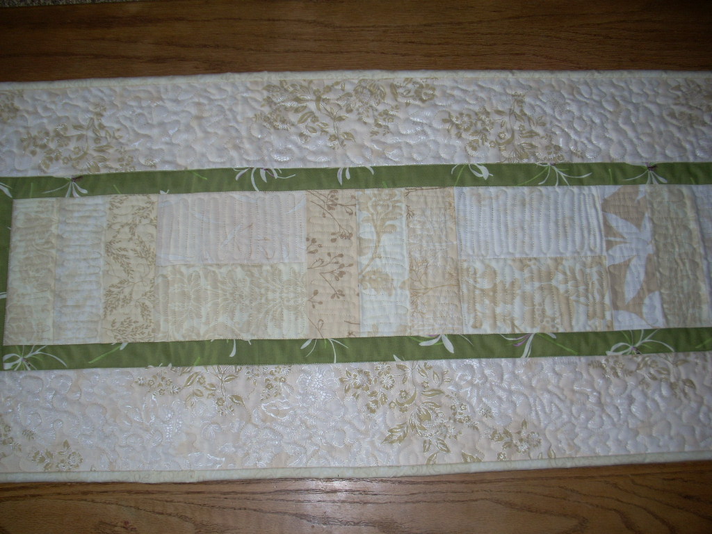 The time for a wedding has arrived for our family! Yeah!!! We are all so excited for our daughter, our future son-in-law and all the family and activities upcoming! I thought you might enjoy seeing some projects that will be given away over the next few days. The creme table runners are part of the bridesmaid’s gifts, the Make Life table runner is for some of our dear friends who are hosting part of the activities and the baby quilt is for some other dear friends who have just adopted a darling boy from China. Enjoy! Happy Wedding Eric and Ashley – we love you!!!