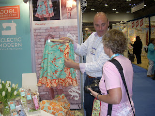 here is a much nicer picture of Joel Dewberry talking with Stephanie about one of his skirt patterns…new fabric line sometime in the fall, I think he said.