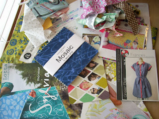 The dress pattern, the Alison Glass print on the bottom, the cotton+steel postcard…..